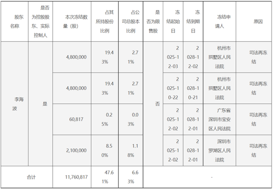 截至本公告披露日,李海波先生及其一致行动人西藏海纳博创投资控股有限公司(以下简称“西藏博创”)累计被冻结的股份情况如下: